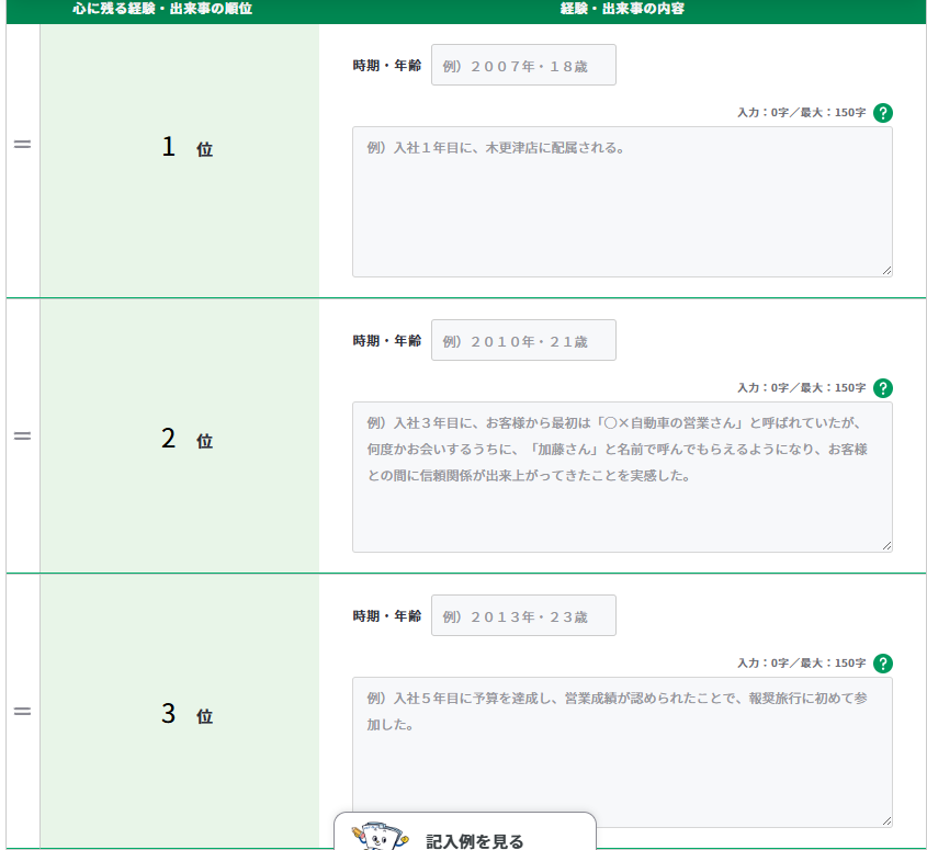 【A-1】等を踏まえ、いつ、どこで、誰と・誰に対して、何を、どのように、どんな印象(良し悪し)を受け、どんな影響(ターニングポイントなど)があったか等、3つ以上(最大10)の経験・出来事を順位付けして、できるだけ具体的に記入してください。