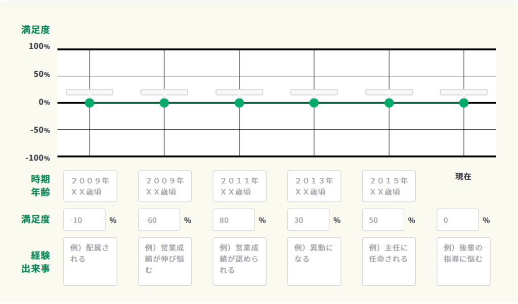 ②その経験・出来事について、時期と満足度入力し、「コメント」欄に経験・出来事の内容を記入します。満足度は、最高100%から最低-100%まで入力できます。