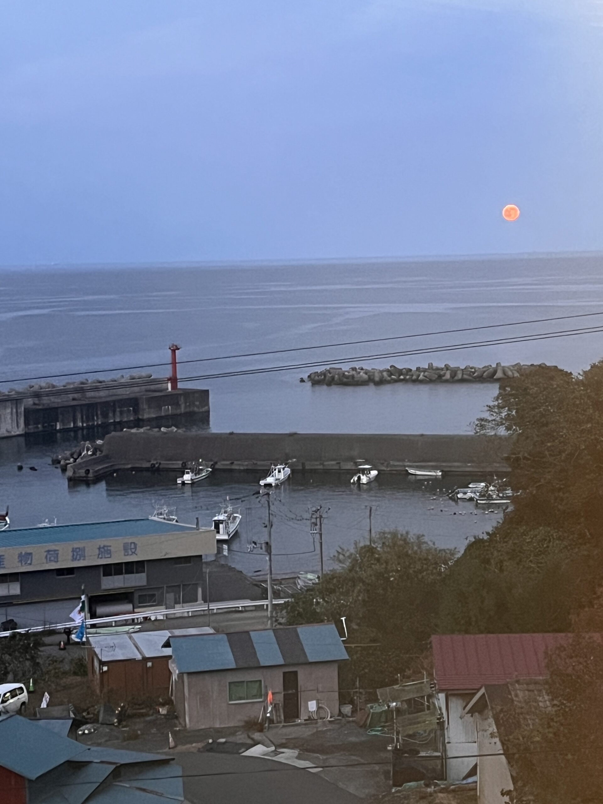 (写真:車窓からの夕方の三陸沿岸漁港)