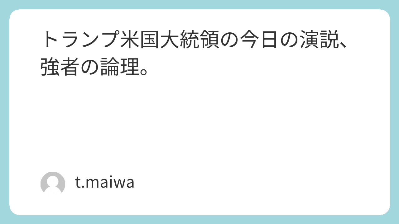 トランプ米国大統領。今日の演説、愚かさに驚くばかりです。後片付けもしない国家元首、ホルムズ海峡閉鎖の元凶を作ったのはあなただ。あなたが大統領でなかったらこんな事は起きなかった。憧れのアメリカに幻滅です。トランプさんをはじめSNSにて情報発信する政治家が出てきましたが、SNSはアルゴリズムに乗った愚者を選挙で選んでしまう欠点があるような感じがします。愚者のメディアになったのは、Twitter社(現X)やFacebook社(現Meta)が「製品」を開発しただけで人間が使う「商品」の開発まで至っていなかったことだと思います。金儲けを急いだ欠陥商品だと思います。有名人や無名人のともに迷惑している人が多いはずですね。